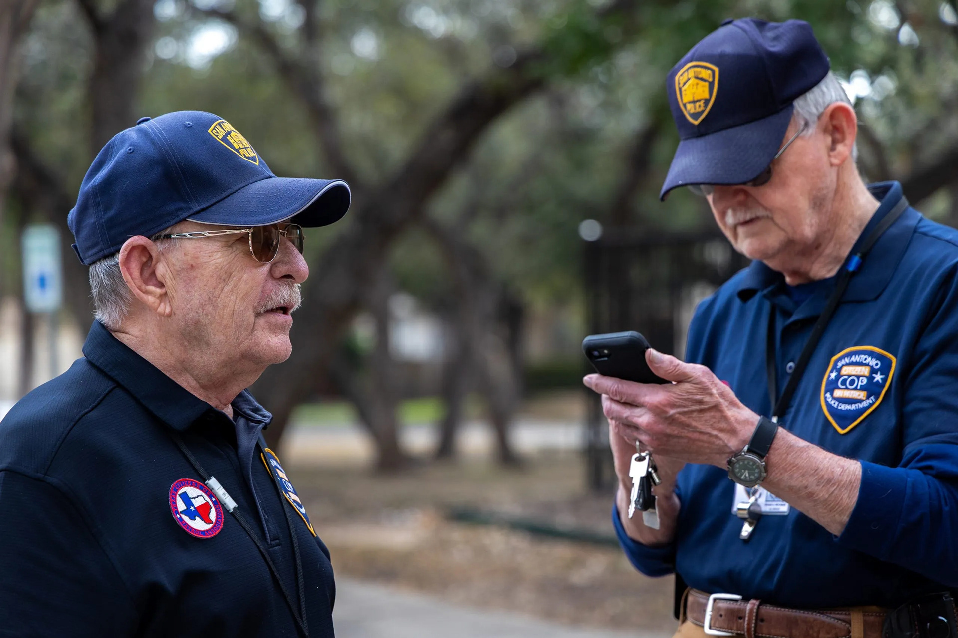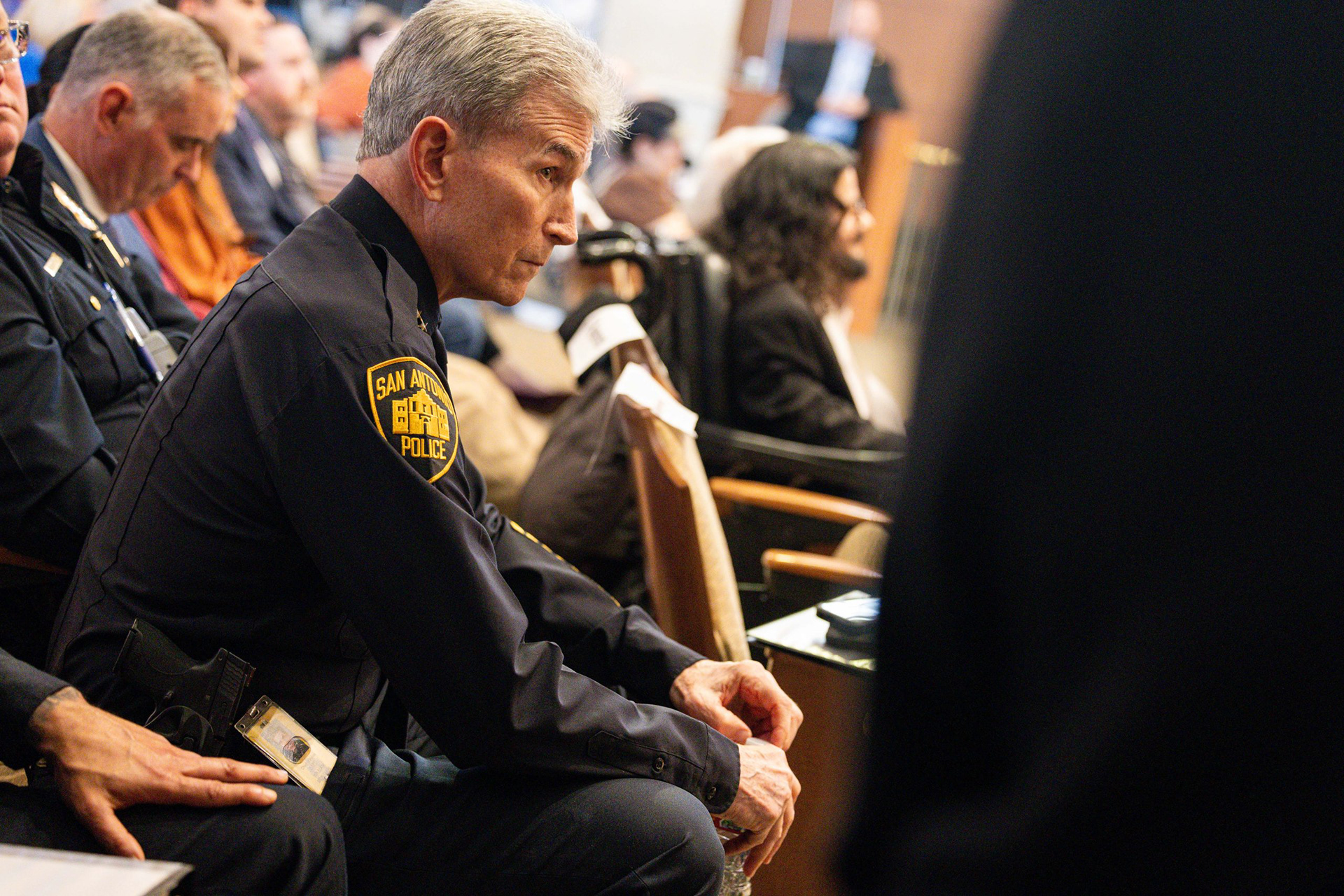A San Antonio police officer whispers into Police Chief William McManus’ ear during a city budget work session on public safety on Aug. 19, 2025, in San Antonio.