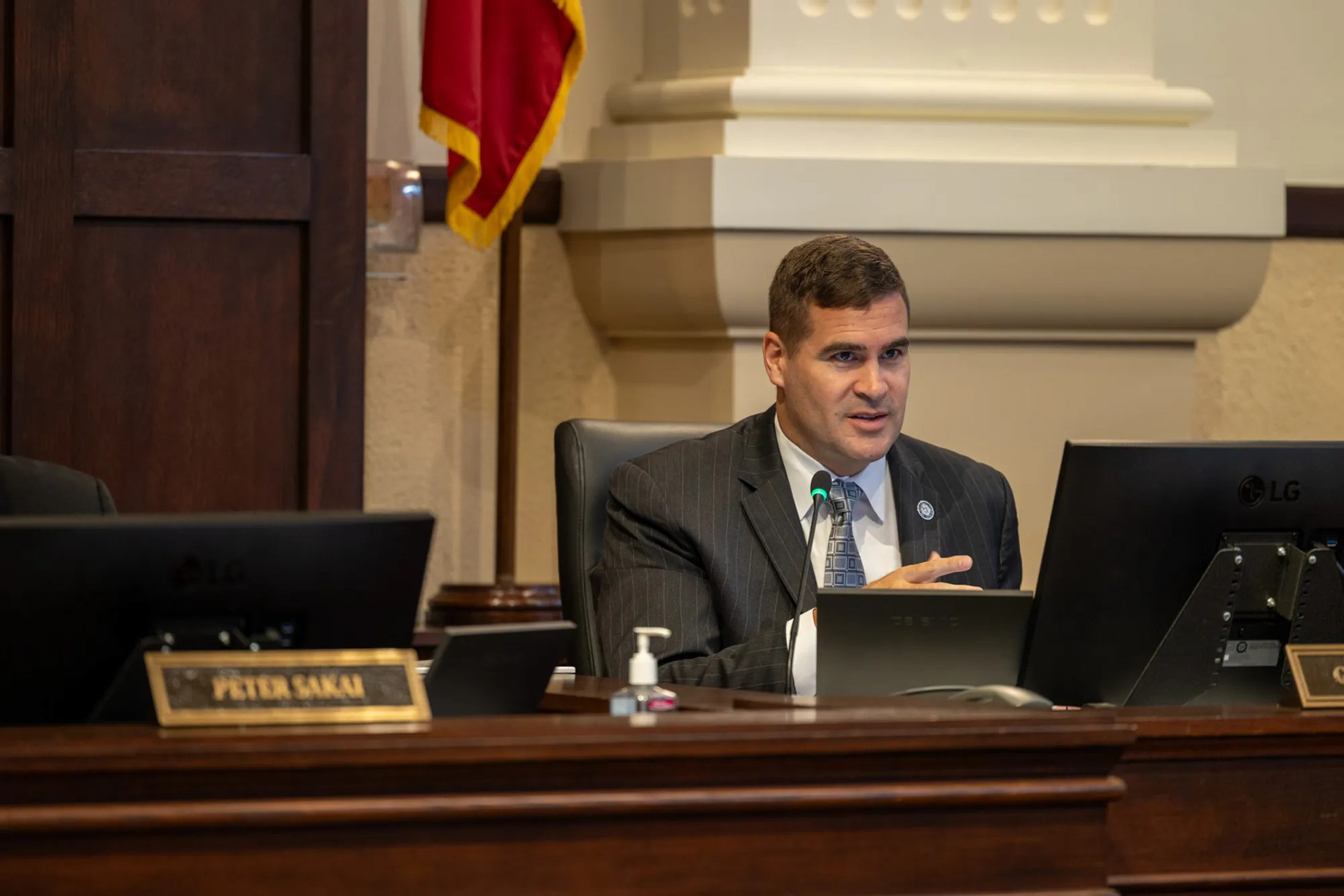 County Judge Peter Sakai listens to a presentation from Sheriff Javier Salazar requesting budget amendments on Aug. 26, 2025, during a county budget work session in San Antonio.
